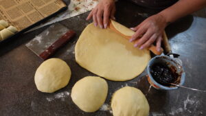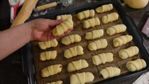 - Formiranje kiflica: Testo podelite, razvijte, secite trouglove i filujte džemom. Uvijte u kiflice. / Divide the dough, roll out, cut into triangles, add plum jam and roll up into crescent rolls.